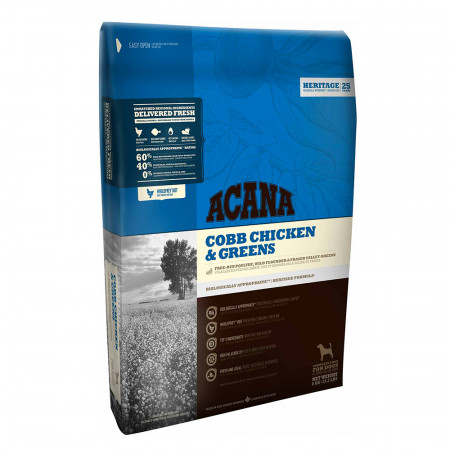 El pienso Acana Heritage Cobb Chicken & Greens es una dieta completa que nutrirá y cubrirá las necesidades de cualquier perro adulto(sin importar ni raza ni tamaño). Elaborado básicamente con pollo de Cobb de corral y platija salvaje como ingredientes cárnicos.