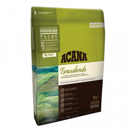 La fórmula única sin cereales de Acana Grasslands promueve la condición física en de tu mascota. Acana Grasslands se fabrica con sustancias altamente seleccionadas y frescas de Canadá. Alta en proteínas, baja en carbohidratos y sin cereales para ajustarse mejor a su dieta natural.