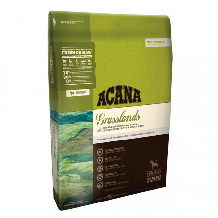 Acana Grasslands con cordero neozelandés, pescado canadiense, huevo completo y, sin cereales. Promueve la condición fisica en perros de todas las razas