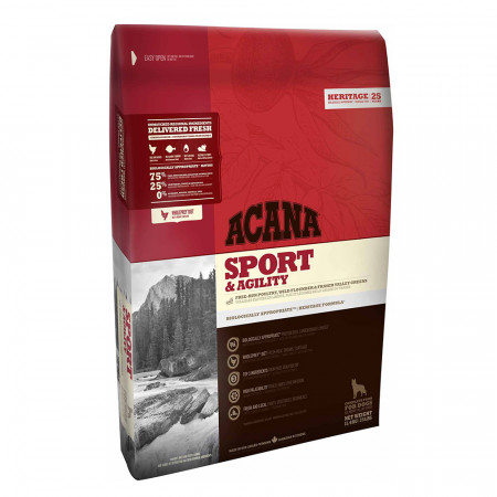 ACANA SPORT & AGILITY está llena de carnes y grasas de primera (un 60%) fácilmente digeribles que incluyen pollo de corral y huevos enteros FRESCOS de granjas locales, y salmón del Pacífico (una rica fuente de ácidos grasos omega 3EPA y DHA) que llega FRESCO desde las frías aguas de la Isla de Vancouver, por lo que nunca se congela y no tiene conservantes.