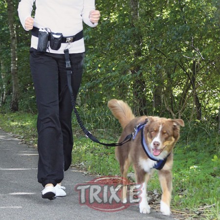 Cinturón para salir a correr con tu perro. Su extensor elástico reduce los tirones y su mosquetón especial evita que se retuerza. El cinturón incluye bolsillos para el teléfono móvil y para golosinas.