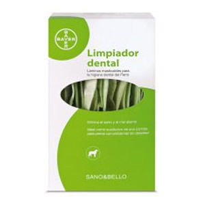 El Limpiador Dental en láminas es un producto natural que contiene sustancias presentes en la saliva del perro para mantener limpia la dentadura. Masticar las láminas ayuda a prevenir la formación de sarro, que oscurece los dientes, provoca el mal aliento y amenaza la salud bucal. Además, la composición de las láminas las hace muy recomendables para su uso como complemento en dietas para perros con problemas de peso. Son bajas en calorías, pero aportan sustancias y tienen efecto saciante.