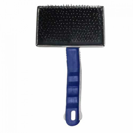 Carda clásica de púa reforzada para perros. Cabezal plano metálico semi articulado. Mango ergonómico de plástico y goma. El largo y grosor extra de las púas sumado a su articulación limitada convierte a esta carda en un utensilio ideal para la eliminación de nudos y enredos de cualquier tipo de manto y densidad.