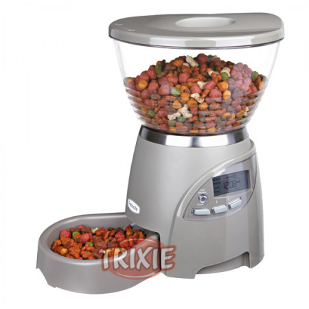 Comedero automático con capacidad de hasta 2,25 kg de alimento seco con programación de horas de comida (hasta 3 al día). Fácil de llenar por la tapa extraíble y sencillo de programar. Funciona con pilas