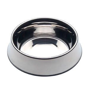 Comedero de acero inoxidable. Tiene una base de goma para evitar deslizamientos y esta elevado unos centrimetros del suelo por la base, para evitar la invasión de hormigas y otros insectos, protegiendo la higiene de la comida o del agua.
