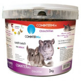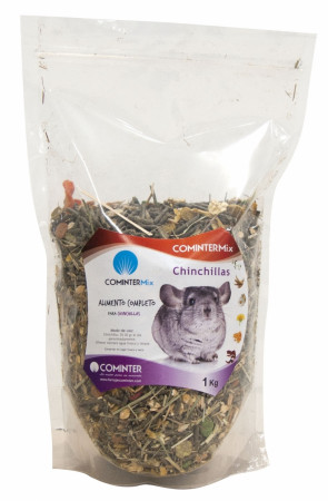 Cominter Mix Chinchilla es un alimento completo de alta calidad que aporta todos los nutrientes necesarios para una buena salud: cereales variados, fibra, Vitaminas A, B, D3, E, C y aceites grasos Omega 3 y 6. Las chinchillas tienen un sistema digestivo delicado, por lo que incluye un alto contenido en fibra para facilitar la digestión. Además incorpora una diversa variedad aromática: zanahoria, manzanilla, diente de león, pétalos de rosa y pétalos de girasol.