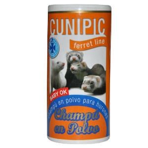 Champú en polvo, para todo tipo de hurones, indicado para hurones baby, ya que, no es necesario mojarlos. Gracias a su composición absorbente consigue eliminar los olores, absorber la grasa y dejar perfumado el pelo.
