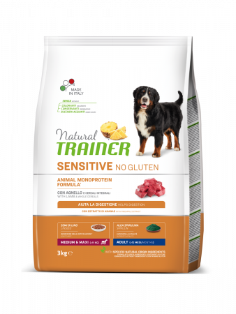 El pienso Natural Trainer Sensitive No Gluten tiene una fórmula adaptada con cordero, cereales integrales, extracto de piña y prebióticos que contribuye a mejorar y mantener la salud del aparato digestivo. Además, añade yucca schidigera para promover un buen tránsito intestinal y reducir el olor de las heces. Es un alimento completo y equilibrado que aporta todas las proteínas, grasas, vitaminas y minerales que los perros necesitan para estar fuertes, sanos y con una gran vitalidad.