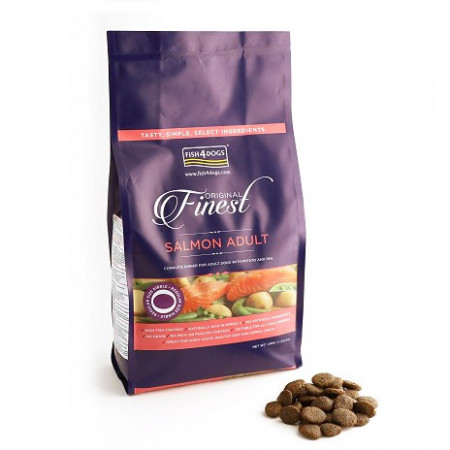 Pienso para perros que contiene más de un 55% de salmón fresco y patata. No todas las proteínas son iguales. La proteína del pescado es de alta calidad y de fácil digestión, además es relativamente baja en grasas saturadas y calorías con lo que es muy saludable y útil para un pienso para perros.