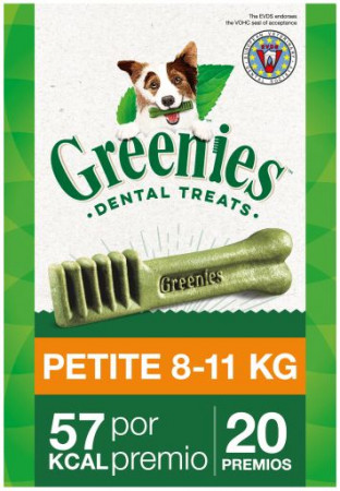 Greenies™ Petite está indicado para perros entre 7 y 11 Kg. Elige el tamaño adecuado del nuevo hueso dental Greenies™ para tu perro. Los premios que no se adaptan al tamaño de su mandíbula no le aportarán beneficios cuando los mastique y si son demasiado grandes le pueden proporcionar calorías que no necesita. No apto para perros de menos de 2 Kg o cachorros de menos de 6 meses de edad.