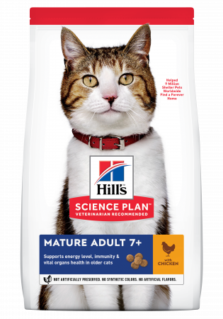 Los gatos requieren de cuidados alimenticios específicos y a medida que se hacen mayores se vuelven más exigentes. Hill\'s Feline Mature Adult 7 Active Longevity Pollo te ayuda a hacer frente a los problemas derivados de la edad de las mascotas a partir de los 7 años, como los que tienen que ver con las funciones renales y los órganos fundamentales