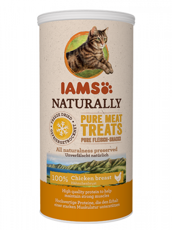 Las golosinas IAMS Naturally carne pura están cuidadosamente liofilizadas para preservar los nutrientes importantes y el sabor de la pechuga de pollo para que su gato disfrute. Nuestras golosinas están elaboradas con ingredientes naturales y son altamente digestibles. Nuestras golosinas 100% de pollo contienen proteínas de alta calidad para ayudar a mantener los músculos fuertes.