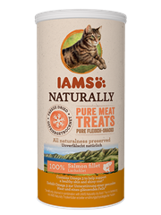 Las golosinas IAMS Naturally de carne pura están cuidadosamente liofilizadas preservando los nutrientes importantes y el sabor, para el disfrute de su gato. Nuestras golosinas están elaboradas con ingredientes naturales y son altamente digestibles. Nuestras golosinas 100% salmón no solo son sabrosas, sino que contienen omega 3 para fomentar una piel sana y un pelaje brillante.