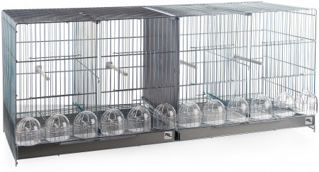 Jaula de cría zincada de cuatro compartimientos. Ideal para canarios, periquitos, diamantes de gould y aves similares.Dispone de dos cajones de plástico para los excrementos. Parrillas extraíbles que facilitan la limpieza. Juego de separadores, uno de plástico y dos de rejilla. Puertas frontales de guillotina. Medidas: alto 42 cm, largo 100 cm y fondo 34.5 cm.