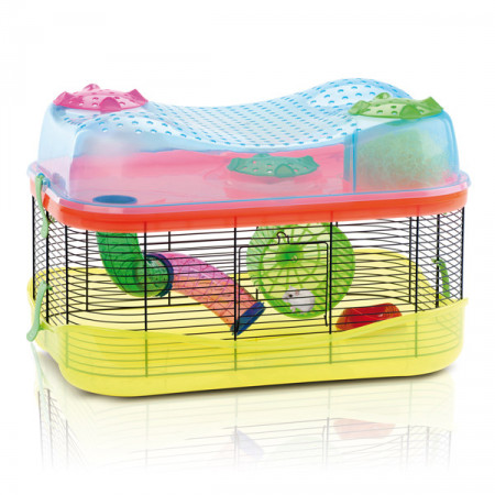 Jaula para hamsters de 2 niveles a todo detalle de accesorios y espacios. Además, es totalmente escalable pudiendo añadir tantos pisos extra como se quiera interconectando varias jaulas con el accesorio de unión.