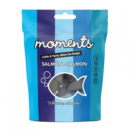 Moments Salmón son fantásticos snacks con divertidas formas y sabores. Son ricos en DHA y libres de grano y de transgénicos.