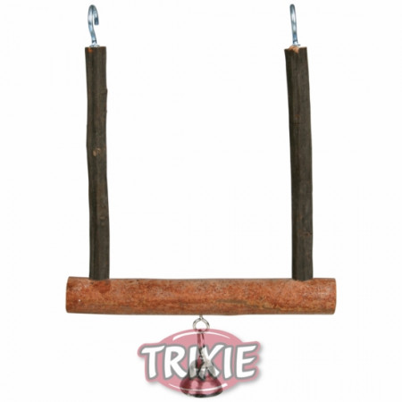 Columpio madera con campana Natural Living, hecho con troquitos de árbol. Este trapecio oscilante de madera natural es un buen accesorio para cualquier jaula de pájaros. La campanilla animará al pájaro a jugar con ella y sentarse en el columpio.