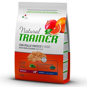 Natural Trainer Adult Medium está elaborado con una combinación de pollo, como aporte de proteínas, y achicoria y alga espirulina como ingredientes funcionales. Un alimento completo que aporta a tu perro medium la energía que necesita.