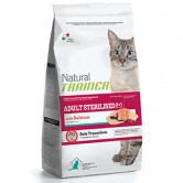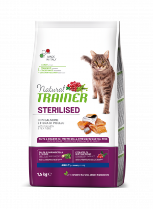 Natural Trainer Adult Sterilised, elaborado con salmón e ingredientes funcionales como el arándano rojo o la menta poleo, cubre todas las necesidades de tu gato esterilizado.