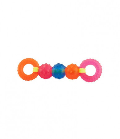 Juguete de goma blanda y flexible para perros pequeños y medianos. Consta de tres bolas unidas por una cuerda interior que acaba con dos anillos, uno a cada extremo. Puedes usar los anillos como asa para agarrar el juguete, arrastrándolo por el suelo o bien lanzándolo al aire.