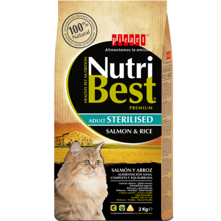 Alimento completo con salmón y arroz para gatos adultos esterilizados de todas las razas.