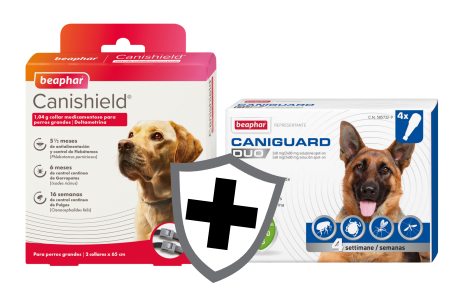El pack incluye: 1 caja de 4 pipetas de Beaphar Caniguard Duo para Perros XS y 1 collar Beaphar Canishield de 65 Cm.