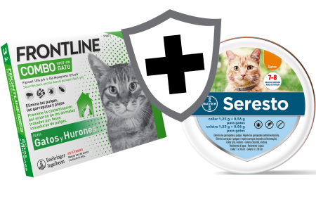 El pack incluye: 1 caja de 6 pipetas de Frontline Combo para Gatos y 1 collar Bayer Seresto para Gatos de 38 Cm.