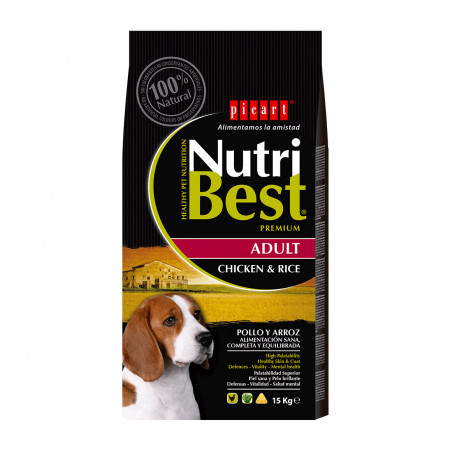 Alimento completo con pollo y arroz para perros adultos de razas medianas y grandes.