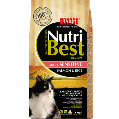 NutriBest Cat Sensitive Salmon & Rice es un alimento Premium formulado por nuestros expertos en nutrición y veterinarios para que tu gato disfrute de una salud óptima. Contiene Algas Marinas del Atlántico Norte para una piel y un pelo sanos y cuidados.