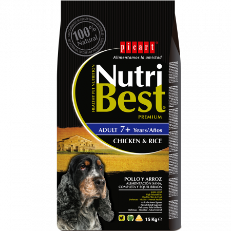 NutriBest Adult 7+ es un alimento Premium formulado por nuestros expertos en nutrición y veterinarios para que tu perro disfrute de una salud óptima. Contiene Algas Marinas del Atlántico Norte para una piel y un pelo sanos y cuidados. Tiene un bajo contenido en grasas y es rico en vitaminas y minerales para favorecer la salud de los perros senior.