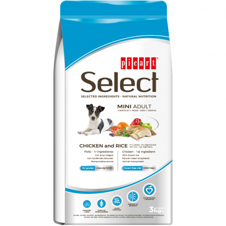 Picart Select MINI ADULT con pollo y arroz está formulado para satisfacer todas las necesidades de tu perro y promover una condición física y salud óptimas. El pollo, como única fuente de proteína animal, le aporta proteínas de alto valor biológico.