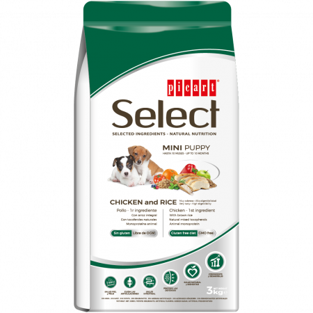 Picart Select MINI PUPPY con pollo y arroz está formulado para satisfacer todas las necesidades de tu perro y promover una condición física y salud óptimas. El pollo, como única fuente de proteína animal, le aporta proteínas de alto valor biológico.