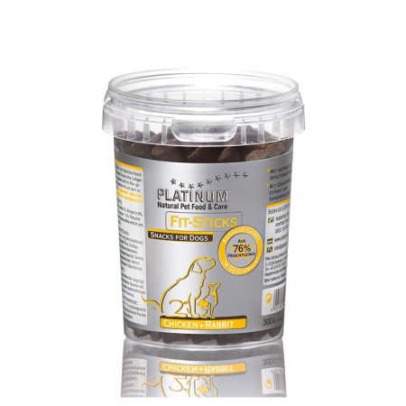 Los Snacks de Platinum se cocinan con el propio jugo de la carne fresca, dejando un 18% de humedad residual, PLATINUM Fit-Sticks son jugosos y deliciosos. Su perro los amará.