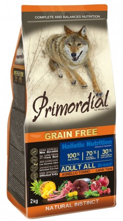 Alimento completo sin cereales, fácil de digerir, rico en proteínas de alto valor biológico y con un apropiado perfil de aminoácidos. El cordero, estrictamente criado en la naturaleza tiene unas proteínas muy gustosas y sabrosas para los perros, el atún tiene una proteína fácil de digerir, buena fuente de ácidos grasos Omega 3, que desempeñan un importante efecto cosmético sobre la piel y el pelaje y beneficioso para el sistema cardiovascular (corazón y arterias).