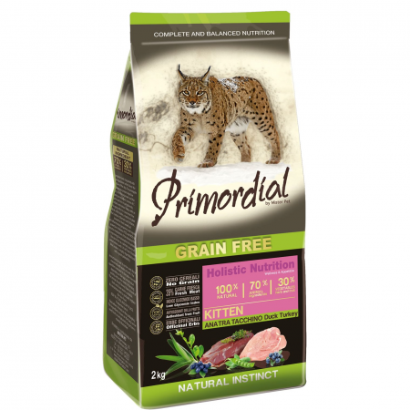 Los gatos siempre han sido depredadores carnívoros y suelen comer carne fresca de aves. Primordial Grain-Free Kitten Pato y Pavo, es un alimento completo sin cereales, fácil de digerir, rico en proteínas de alto valor biológico y con un apropiado perfil de aminoácidos. Rigurosamente criados en tierra (no en gavias) lo patos y los pavos tienen una carne de fácil digestión y muy sabrosa para los gatos. Kitten Pato y Pavo enriquecido con frutas y verduras proporciona vitaminas, minerales y fito-nutrientes, la Lespedeza con propiedades beneficiosas para el tracto urinario, Arándano Negro con acción antioxidante y la buena fuente de linaza de ácidos grasos Omega 3, que desempeñan un importante efecto cosmético en la piel y el pelaje hacer esta comida un equilibrio de sabor y nutrientes, una verdadera y su producto integral, lo que ayuda a llevar la acción saludable en todo el cuerpo del gato.