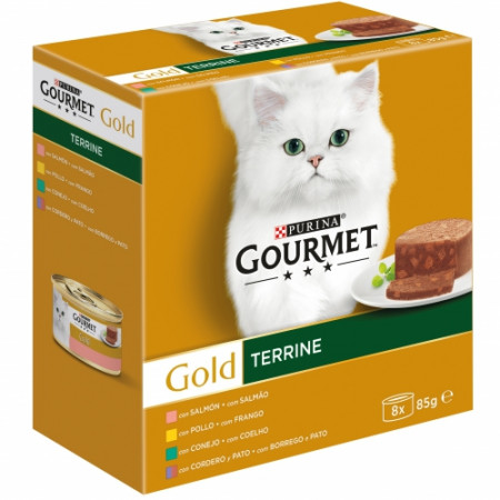 Tu gato es un verdadero experto y le gusta probar diferentes texturas y sabores cada día. Por eso GOURMET Gold ha creado Terrine, sabrosas recetas para mimar su sofisticado paladar con una experiencia diferente de sabor en cada comida. Tiernos bocados con carnes o pescados finamente cortados y combinados con tiernos trocitos para ofrecer a tu gato el placer de una ligera y apetitosa textura. Terrine de GOURMET Gold una extensa gama de sabrosas recetas para ofrecerles momentos de sabor cada día.
