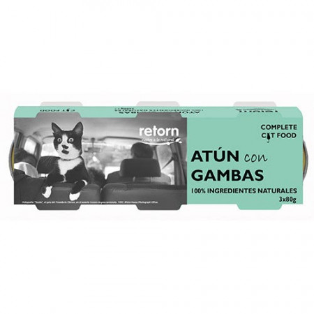 Producto natural húmedo a base de lomo de atún (45%) y gambas (5%). Retorn son productores de alimento para mascotas de alta calidad y con productos naturales. Gracias a los productos naturales utilizados estos alimentos son muy beneficiosos para la salud.