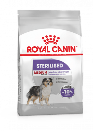 Pienso especial de Royal Canin para perros castrados de razas medianas (11-25 kg), contiene muchas proteínas y muy poca grasa, con L-carnitina para ayudar a quemar las grasas.