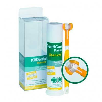 El kit dental Dentican para perros es un completo pack compuesto por un cepillo Difresh y una pasta de dientes Dentican, cuyo principal objetivo es que tu mascota tenga un aliento fresco y unos dientes sanos y limpios. Además combate la placa bacteriana y controla el sarro de tu mejor amigo. El cepillo dental Difresh tiene un triple cabezal flexible, cómodo y eficaz. Su forma ergonómica está especialmente desarrollada para los dientes caninos.