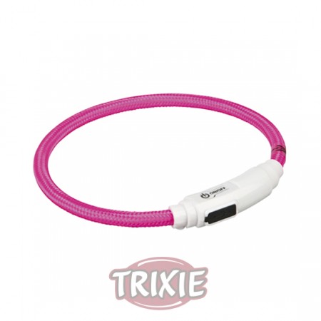 Aro luminosos para mayor seguridad durante los paseos nocturnos o en situaciones de baja visibilidad. Con dos modos de luz: intermitente y continua. Puedes recargar el collar a través de un cable USB. La talla es adaptable con un solo corte. La duración de la batería es de 5 a 8 h. Color Rosa.