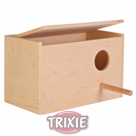 Nido cerrada para pájaros pequeños como los periquitos. Apertura superior con tabla abatible que facilita la limpieza. Lleva un percha de aterrizaje exterior.