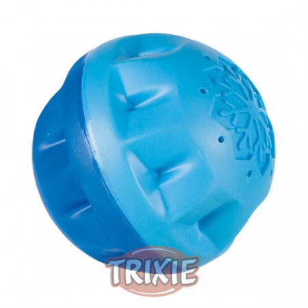 Pelota de caucha termoplástico , robusto y duradero, que absorve el agua. Cuando el perro mastica la pelota, esta suelta el agua de su interior. Para un plus de frescor, se puede congelar. también es idual para cachorros, ya que facilita la dentición.