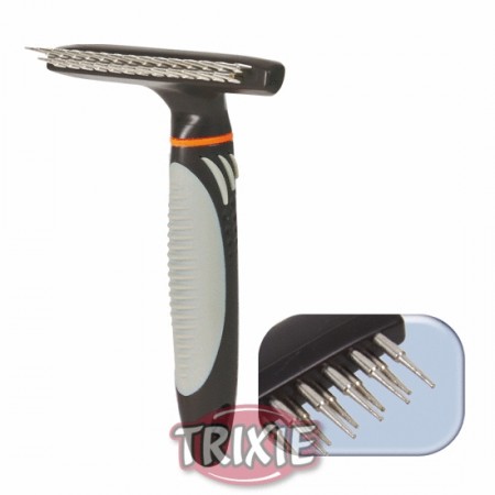Rastrillo ideal para el cuidado intensivo del subpelo con dos filas de púas metálicas y asa de con goma antideslizante.