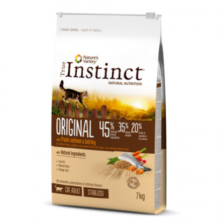 El pienso para gatos esterilizados True Instinct Original Sterilized es un alimento formulado con salmón y pollo, que está diseñado para gatos adultos esterilizados con problemas de sobrepeso o con tendencia al sobrepeso. Esta comida contiene un 16% de salmón, un 15% de pollo deshidratado y un 8% de cerdo, y es baja en grasa para ayudar a controlar el peso de tu mascota.